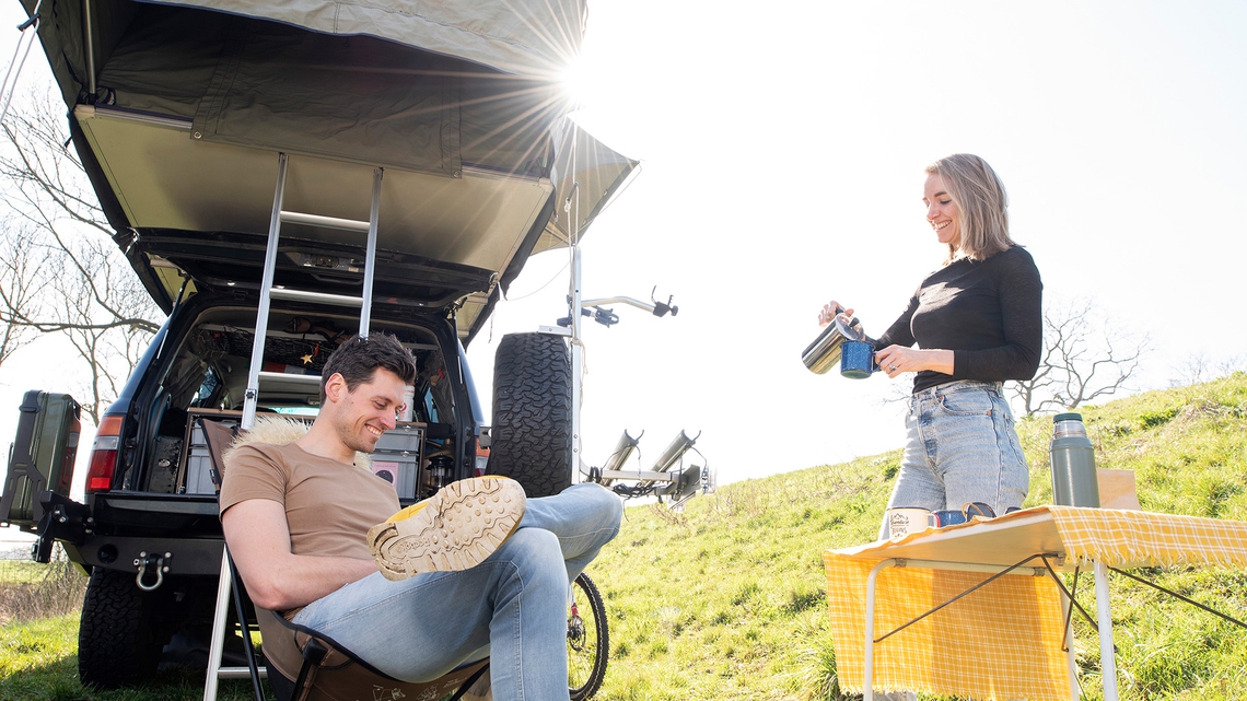Annelouc: “Iets waar we geen spijt van hebben is de auto met de gehele set-up. We slapen in een daktent en hebben een huisje gecreëerd van Ted. Onze droom was om zelfvoorzienend te leven en dat gaat ons goed af. We hebben alleen eten en diesel nodig, de rest hebben we allemaal zelf.